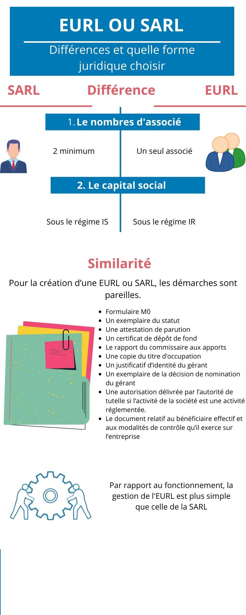 Les processus de créations des EURL et des SARL sont identiques. Elles demandent eux deux la rédaction de statuts, le dépôt de capital, l’annonce légale et l’inscription au RCS.